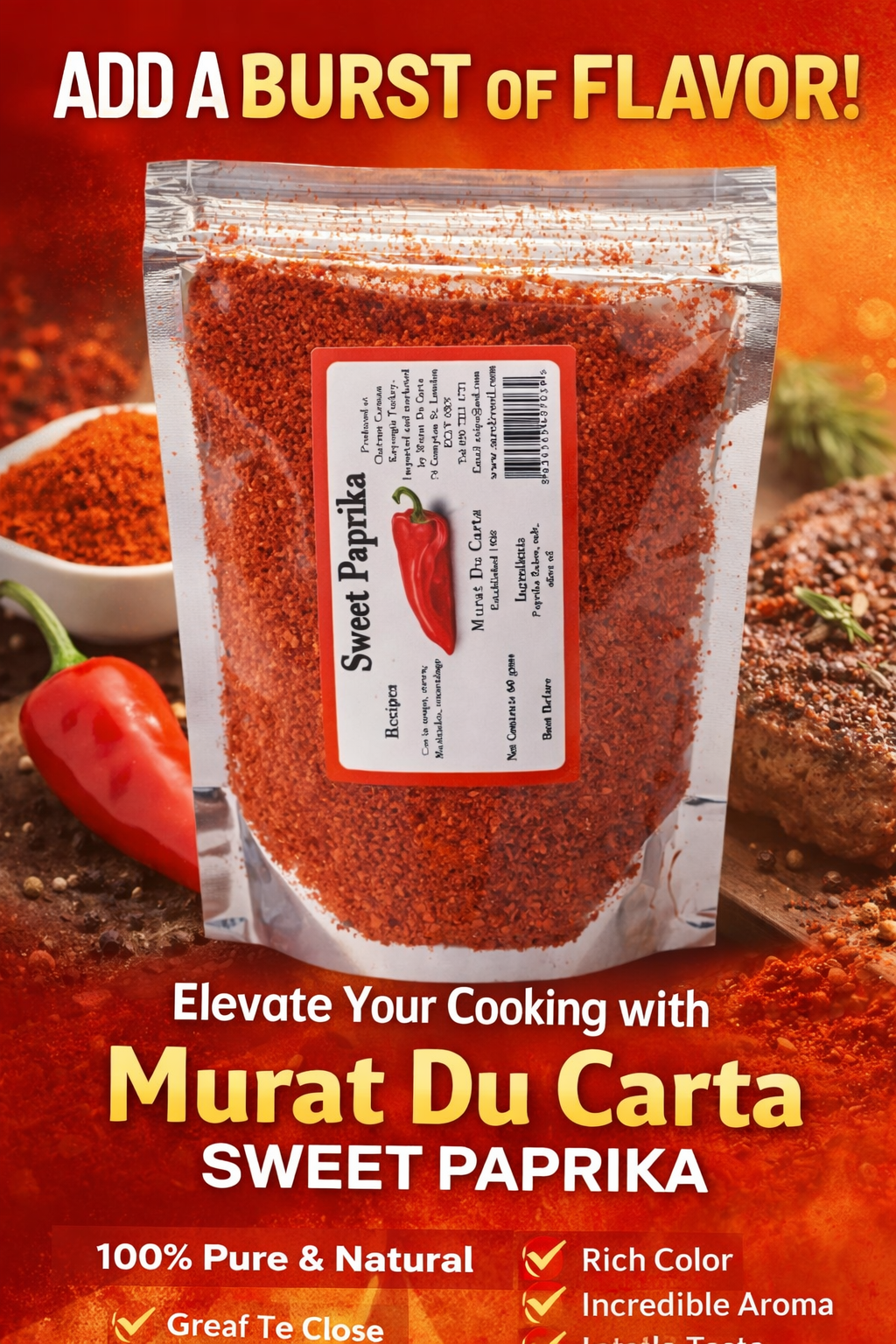 Home / Spices / 60 gms organic sweet paprika £3.50 Paprika grown and dried in Sunlight on our farm and then milled and prepared with salt and olive oil 60 gms organic sweet paprika quantity Add to cart Category: Spices Product ID: 1011 Description Description Grown and dried in Sunlight on our farm and then milled and prepared with salt and olive oil Related products murat du carta sumac £2.50 Add to cart 60 gms Organic chilli flakes £3.50 Add to cart