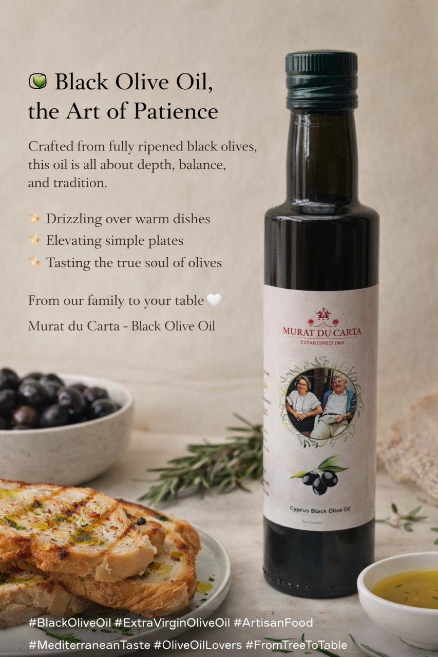 our olives are picked and dried on the terraces and then boiled before pressing to produce this intense flavoured black olive oil, unique to Cyprus, my mother used to make a black eye bean dish with courgettes or spinach and dress with this olive oil together with lemon juice or a mild vinegar
